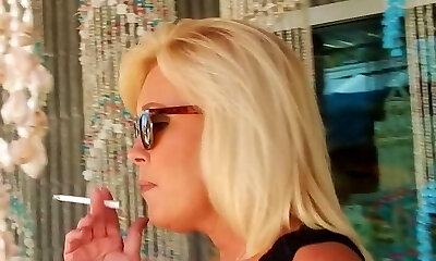 Smoking in daisy dukes and prostitute high-heeled slippers