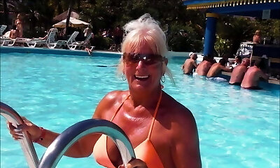 Skinny hairy blonde Mature with ginormous tits in high heels