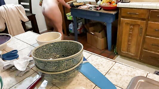 Naturist housekeeper Regina Noir cooking in the kitchen. Bare maid makes dumplings.