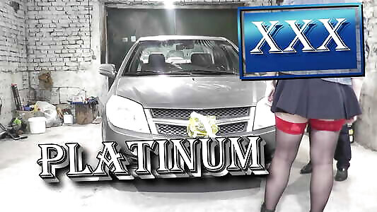 Naked towheaded Cougar in car repair store repairs client auto. No panties under microskirt. No boulder-holder. Without panties in public Cougar