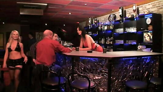 Platinum-blonde pub bartender organizes an intercourse with her clients