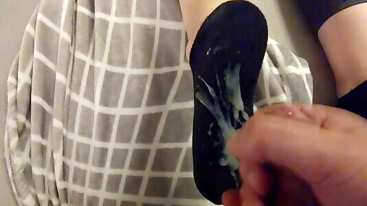Hot foot job from sexy girl in black lingerie and black nylon stockings