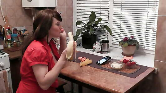 Without panties in kitchen gorgeous brown-haired Cougar munches banana fruits with testicle tonic frigging wet cootchie and orgasm. Handjob