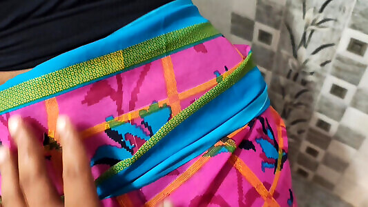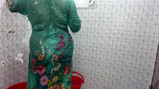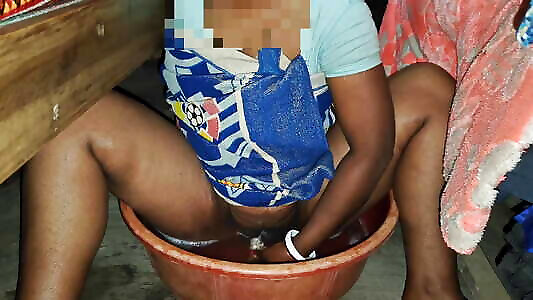 Indian sister-in-law is bathing in the open courtyard of the house, putting a finger in her burrow and rubbing the body, sister-in-law is washing the bathroom.