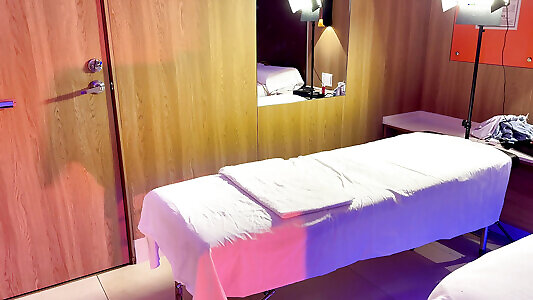 Raven haired pretty orgy female likes having sizzling time with her mature guy in rubdown parlour