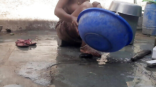 A stepsister from the village undresses and bathes in the open courtyard, a stepbrother watches his stepsister to see her beauti