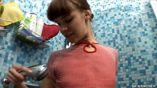 Shower striptease and verri skinny play wtih a super-cute ponytailed teenie