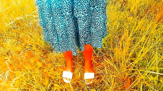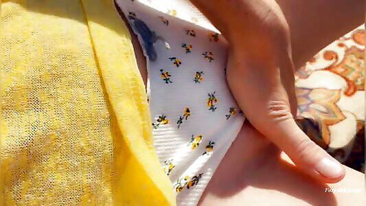 Masturbate petite pussy under panties. Orgasm in garden while watching porn