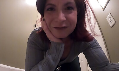 Mature redhed in stockings jerks a rock hard dick to make him cum