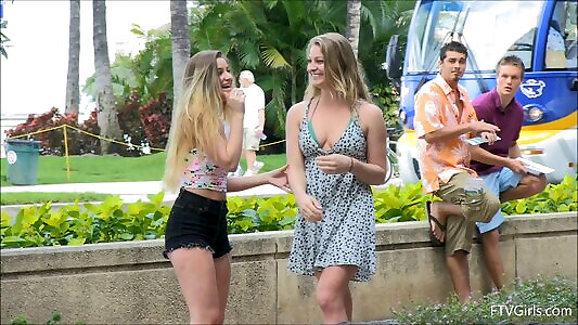 Outdoor spectacle with swimsuit nymphs kissing and finger-tickling beach sex